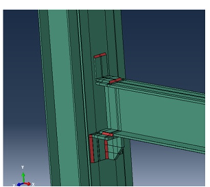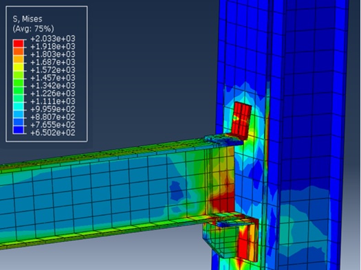 اطلاعات مدلسازی المان محدود اتصال تیر به ستون نبشی نشیمن به شرح ذیل می باشد:1-از المان جامع 3D Deformable-Solid درمدل سازی استفاده شده است (المان C3D27R)، 2-نمودار تنش-کرنش بصورت کامل (الاستیک+پلاستیک) به مدل معرفی شده است، 3-براي شبيه سازی رفتار فولاد از خصوصيت رفتاری پلاستيک کتابخانه آباکوس و معيار تسليم فون ميسز استفاده شده است، 4-جهت اتصال قطعه ها به یکدیگر از قید tie استفاده شده است و اندرکنش سطوح (تماس بین دو سطح) نیز با استفاده از تعریف surface-to-surfacecontact تماس دو سطح شکل پذیر صورت گرفته است. 5-بار به صورت تغییر مکان به وسط تیر اعمال شده است.6-قیود تکیه گاهی به صورتی اعمال شده اند که پای ستون بصورت مفصل می باشد و انتها تیر تنها در برابر لنگر خمشی مقید شده است.7- با توجه به پیچیدگی اتصال، مشبندی به صورت کاملا منظم و استاندارد صورت گرفته است